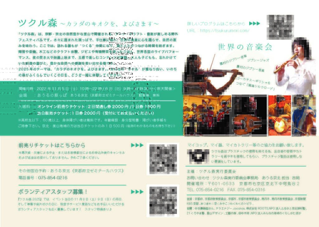 | 電話 | 075-854-0216 ツクル森実行委員会 |